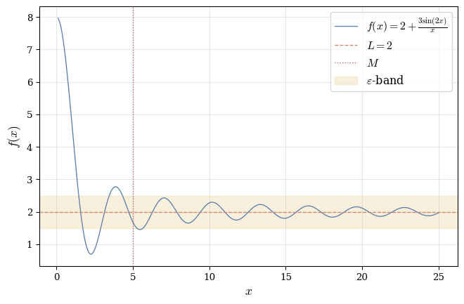 Example 6.1 (Reciprocal Limit at Infinity) For f(x) = \frac{1}{x}, given \varepsilon > 0, choose M = \frac{1}{\varepsilon}. Then x > M implies
