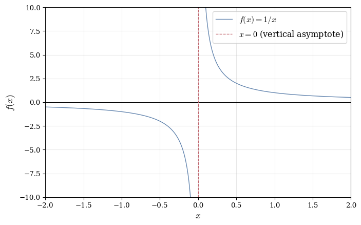 Hence \lim_{x \to 2} f(x) = \infty. We say x = 2 is a vertical asymptote. If \lim_{x \to \infty} f(x) = L, then y = L is a horizontal asymptote.