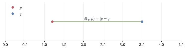 Intuitively, d(p, q) tells us how far apart two numbers are on the number line.