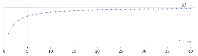 Note: This proof conveys the main idea, but a fully rigorous argument requires the least upper bound property and the completeness of \mathbb{R}—in particular, these are needed to argue that M=\sup \{a_n\} exists and is unique. These concepts are usually developed in a first course in real analysis.