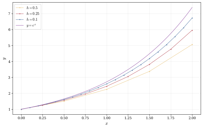 Thus: \begin{align*} y_0 &= 1 \\ y_1 &= 1.1 \\ y_2 &= 1.21 \\ y_3 &= 1.331 \\ &\vdots \\ y_{10} &= 1.1^{10} \approx 2.594. \end{align*}