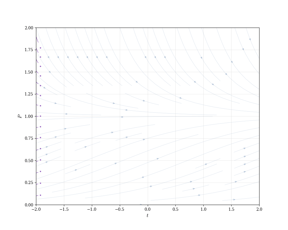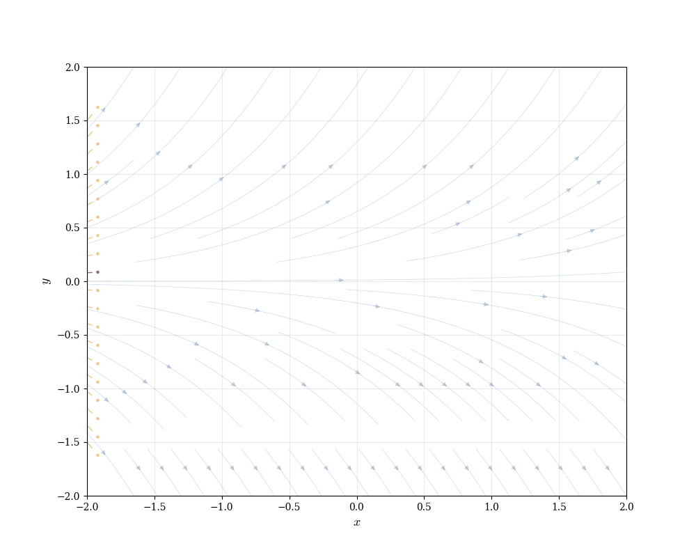 This visualization reveals structure before solving anything algebraically. We see that solutions spread apart exponentially, that there’s a unique curve through each point, and that curves never cross (since two curves crossing would mean two different slopes at the same point, contradicting a later result Theorem 15.1).
