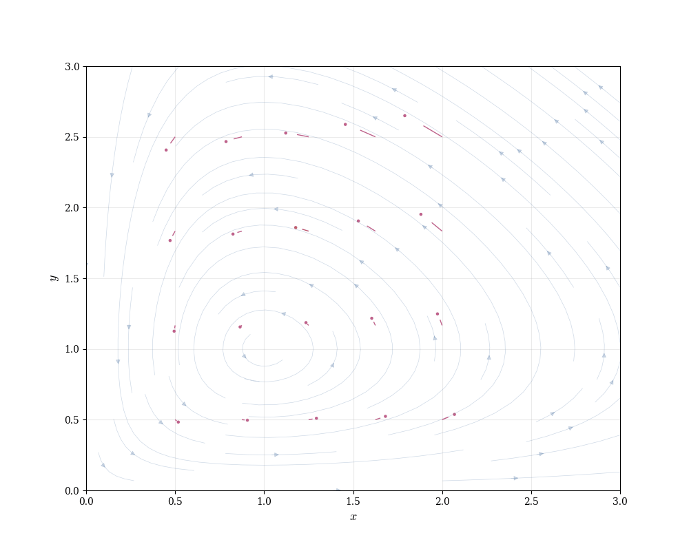 Trajectories spiral around the equilibrium in closed orbits (for suitable initial conditions). Populations oscillate periodically—when prey are abundant, predators increase; this reduces prey, causing predators to decline; prey then recover, and the cycle repeats.