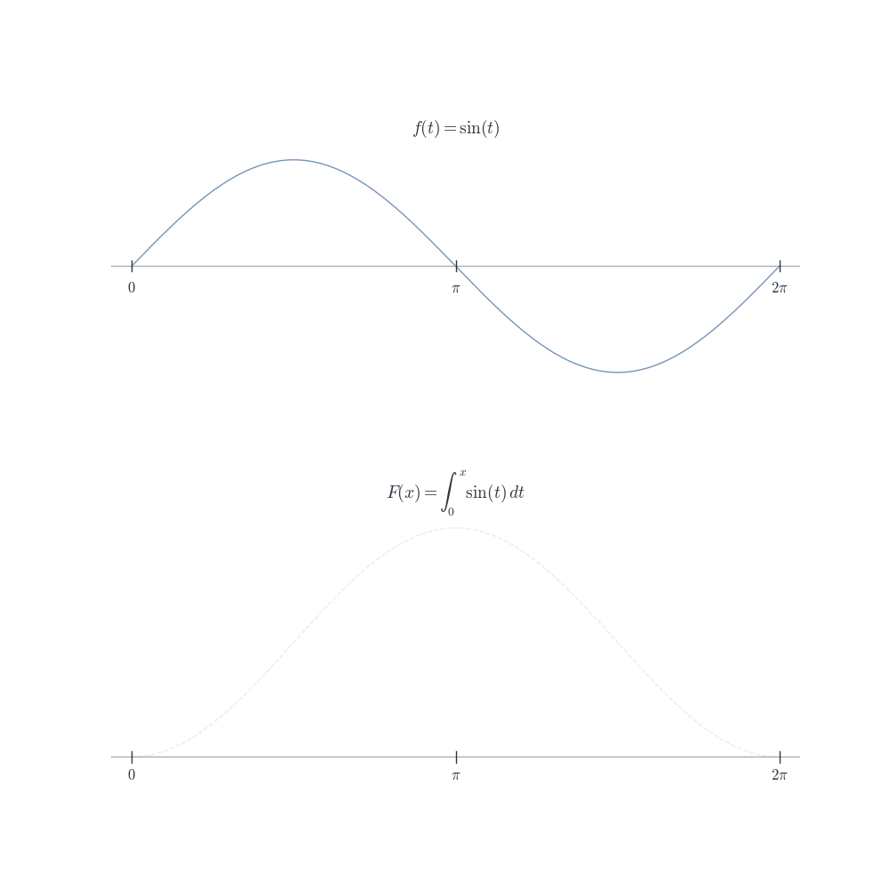 Notation note: We use t as the integration variable to distinguish it from the upper limit x. The variable t is a “dummy variable”—it disappears after integration. The function F depends on x, not on t.