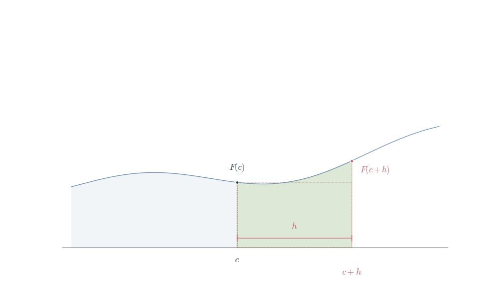 From Part 1, \frac{F(c+h) - F(c)}{h} = \frac{1}{h} \int_c^{c+h} f(t) \, dt.