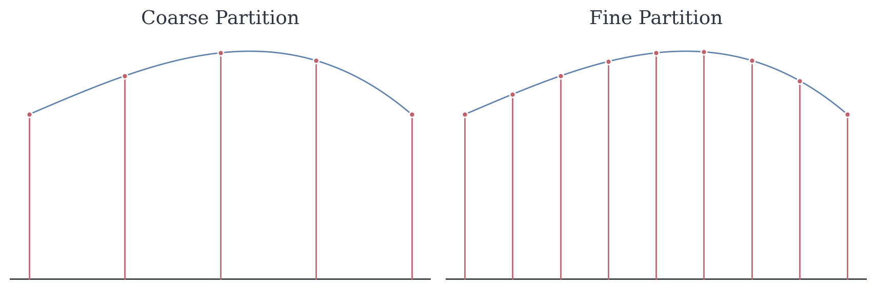 Definition 8.3 (Upper and Lower Sums) L(f, P) = \sum_{i=1}^{n} m_i (x_i - x_{i-1}), \quad U(f, P) = \sum_{i=1}^{n} M_i (x_i - x_{i-1}).