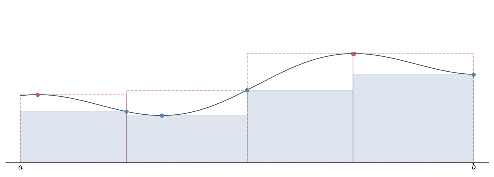On each subinterval [x_{i-1}, x_i], let m_i = \inf\{f(x) : x \in [x_{i-1}, x_i]\}, \quad M_i = \sup\{f(x) : x \in [x_{i-1}, x_i]\}.