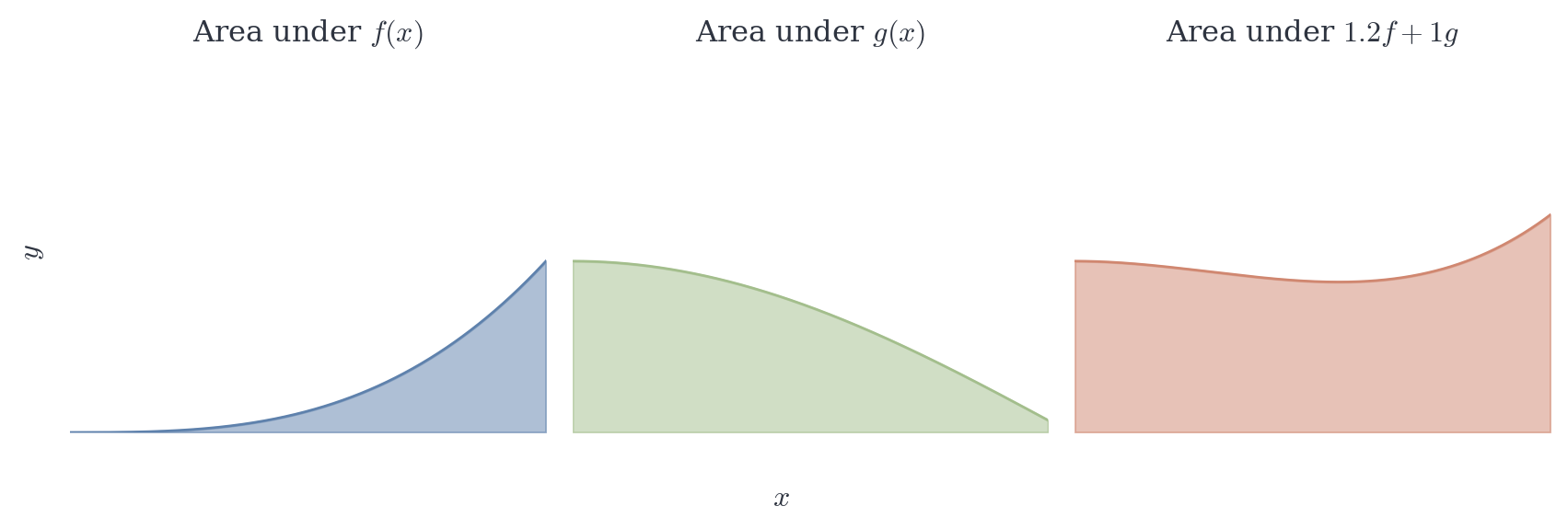Theorem 8.4 (Linearity) If f, g \in \mathscr{R}([a,b]) and \alpha, \beta \in \mathbb{R}, then \alpha f + \beta g \in \mathscr{R}([a,b]) and \int_a^b (\alpha f + \beta g) = \alpha \int_a^b f + \beta \int_a^b g.